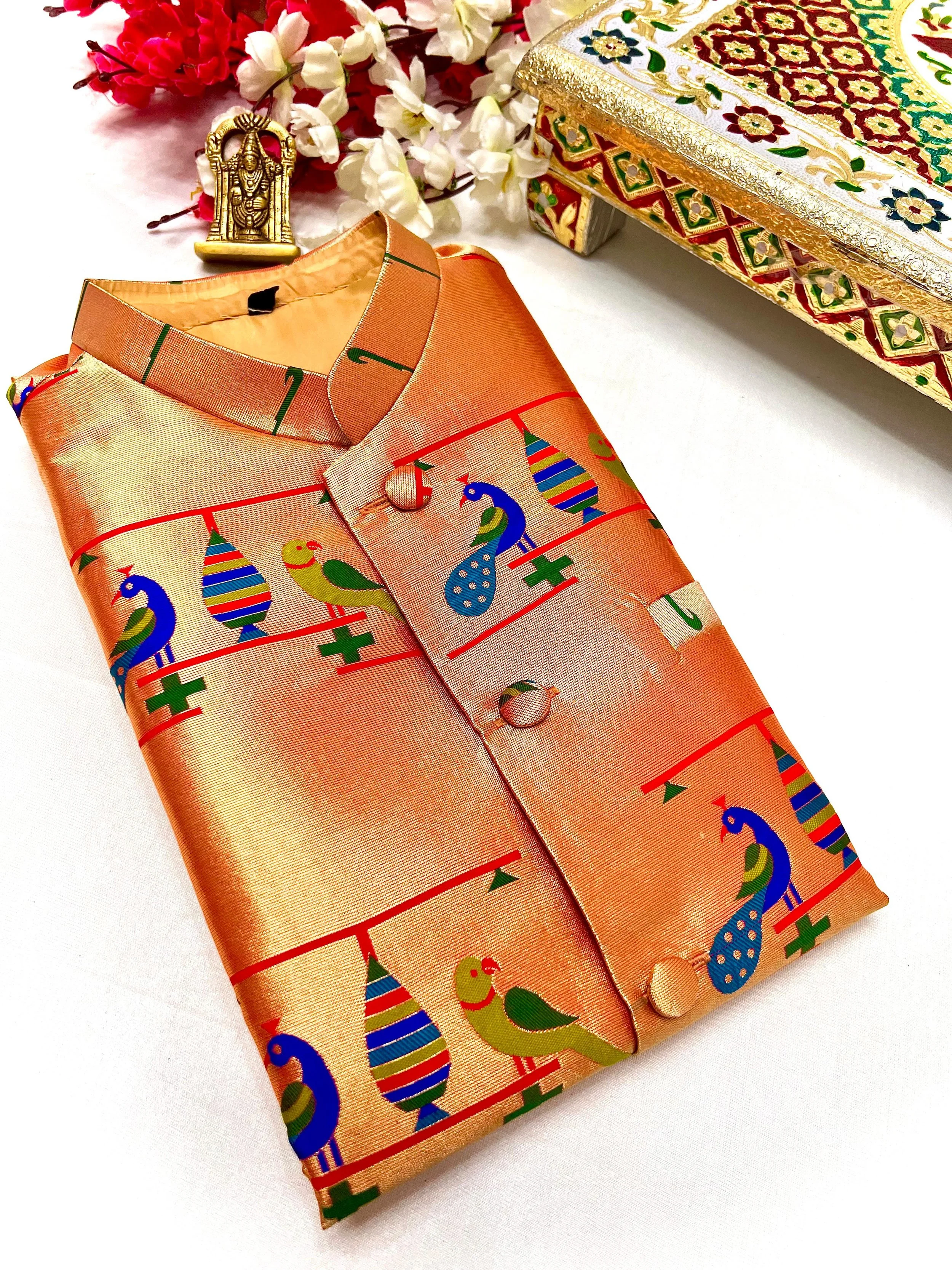 Categories: All Puresilk Paithanis Kanjivaram Puresilk Paithanis Soft Silk Paithanis Khann Sarees Other Sarees Lehenga & Kaftan Readymade 9war Paithanis Paithani Dupattas Readymade Blouse Paithani Purse and Batwa Traditional Jewelry Men's Apparel Men's Traditional Topi Men's Paithani Jacket Girl's Traditional Dresses Other Paithani Items All / Men's Traditional Topi | Men's Paithani Jacket | Men's Vests for all occasions $45.00 Paithani Kurta for Men $45.00 Paithani Jacket for Men $60.00 Paithani Jacket for Men $60.00 Paithani Jacket for Men $60.00 Paithani Jacket for Men $60.00 Maharashtrian Paithani Topi $12.00 Traditional Khan Topi $12.00 Paithani Jacket for Men $60.00 Paithani Jacket for Men $60.00
